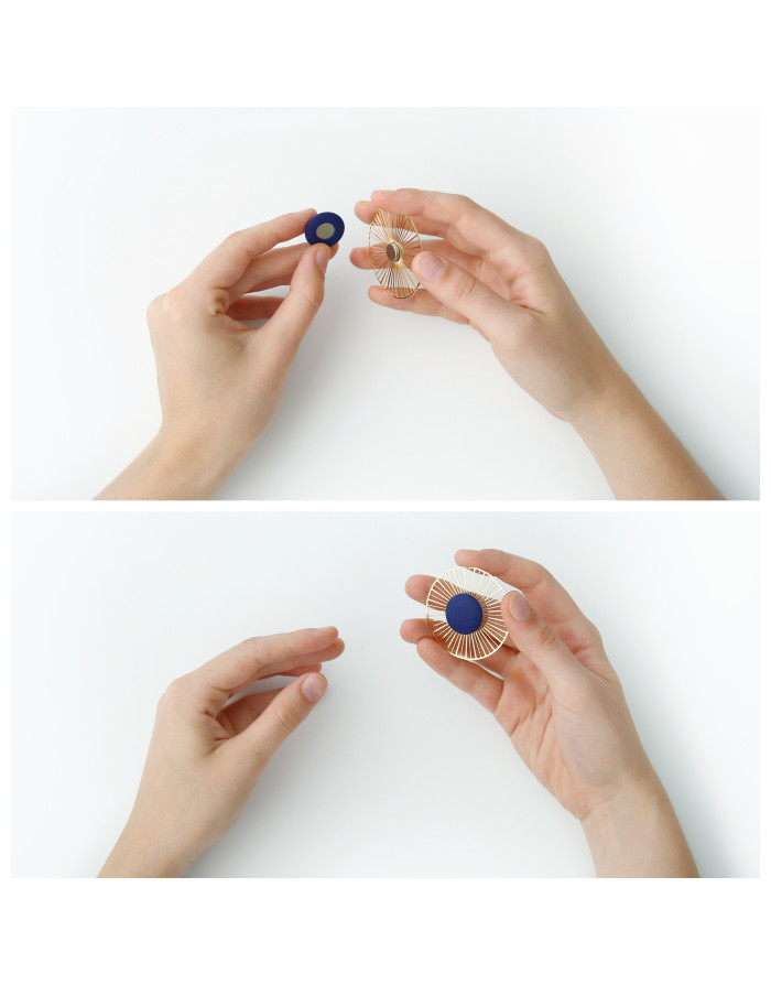 Fabriquées en France, ces broches magnétiques allient simplicité, fonctionnalité et raffinement. Grâce à leur système d’aimant ingénieux, elles se fixent sans abîmer les tissus. Plus besoin d’épingles ni de trous !