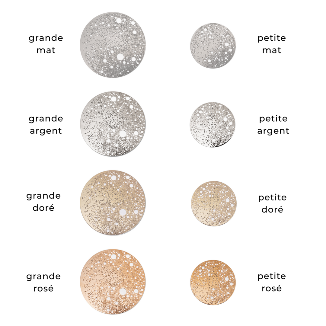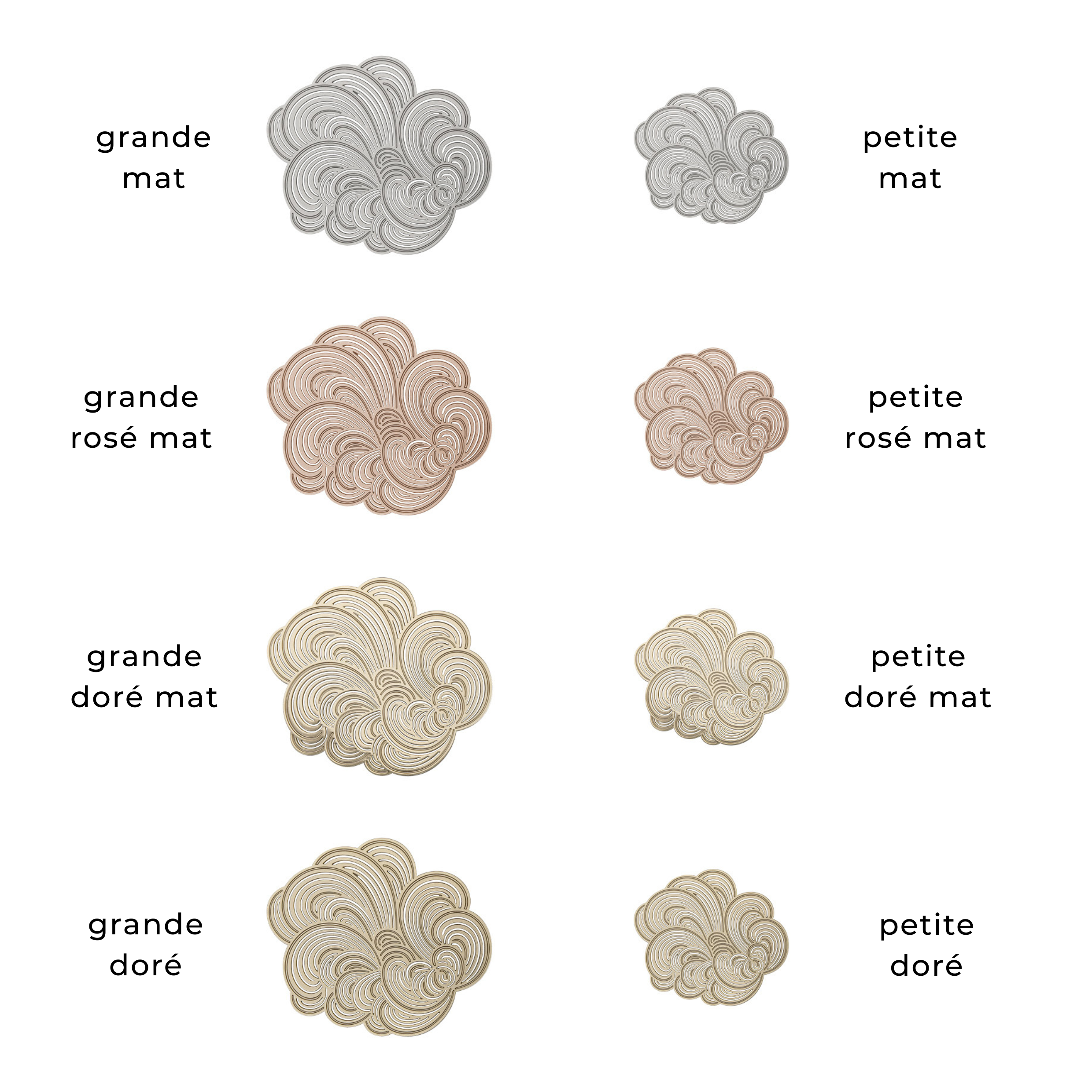 Disponibles en deux tailles et trois formes emblématiques : nuage, soleil et lune, ces broches s’adaptent à toutes les envies. Choisissez parmi trois finitions élégantes : doré, argenté ou rosé, pour sublimer vos tenues avec délicatesse.