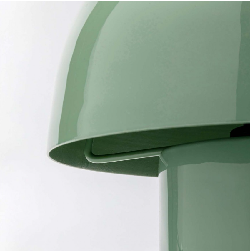 Une lampe champignon sauge en acier émaillé au design rétro, signée Kare Design, dans une teinte apaisante pour une lumière douce et naturelle.
