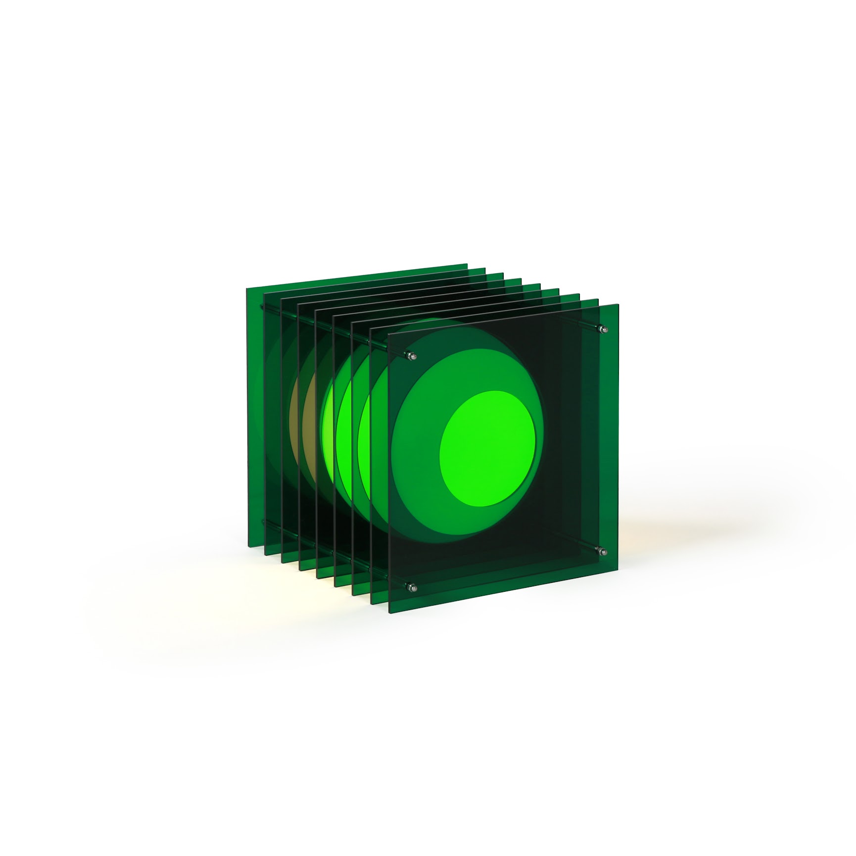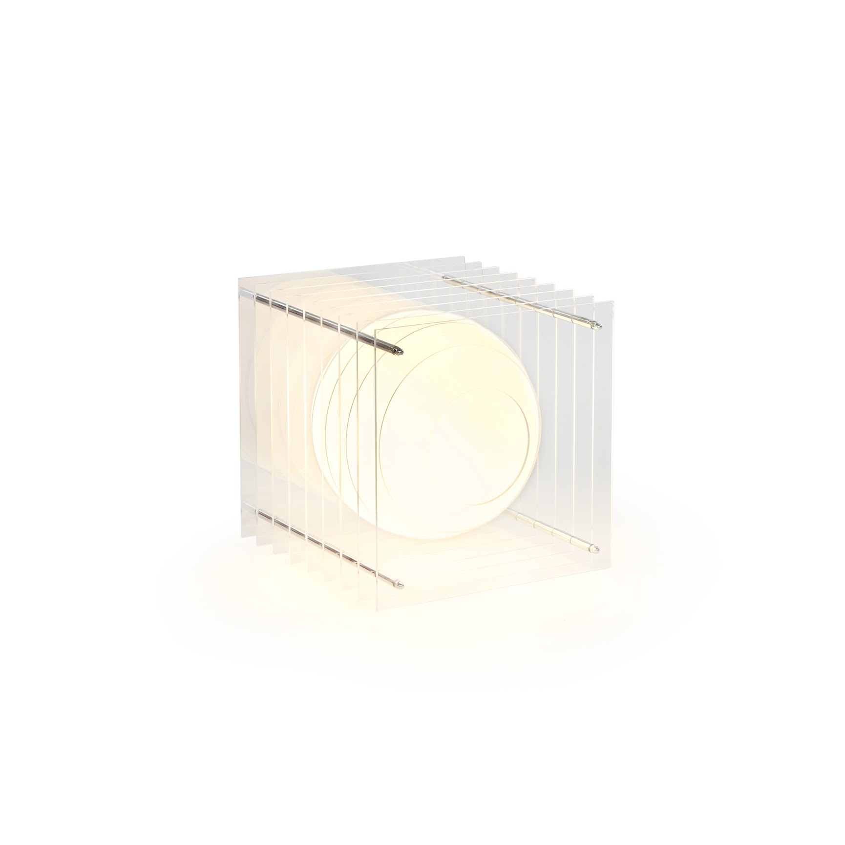 Sculpturale et captivante, la lampe Lop se compose d’une sphère en verre opalin flottant entre plusieurs strates en acrylique. Cette composition crée un jeu de volumes emboîtés et un effet lumineux hypnotique. Une fois allumée, la lumière se réfléchit sur les plaques en acrylique, donnant l’illusion que la sphère se déplace, bien qu’elle reste parfaitement immobile.
